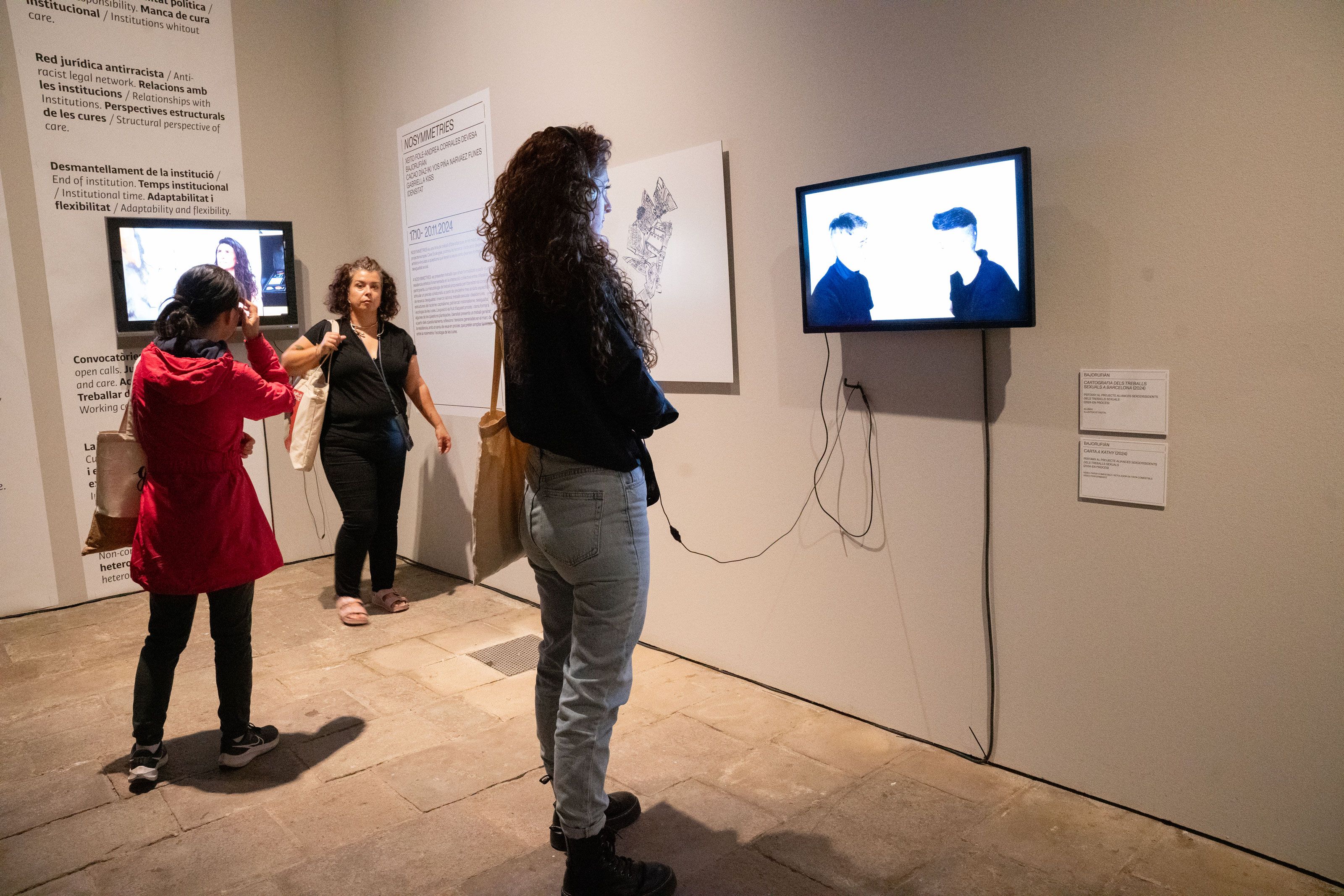 NOSYMMETRIES/EXHIBITION features works produced as a result of an artistic residence founded on collective interaction between various participants. The working methodology proposed by Idensitat involved structuring a collaborative process and predefining four specific areas of research: inequality and entry into the labour market; sex work and dissidence; the structures of racism: capitalism, the patriarchy and colonialism; and inequality and the ecology of care. The exhibition is the outcome of this process and gives shape to some of the questions raised. The works displayed are by Xeito Fole - Andrea Corrales Devesa, BajoRufián, Cacao Díaz - iki yos piña narváez funes - Florencia Brizuela - Ainhoa Nadia Douhaibi, Gabriella Kiss – Impulsem - and Idensitat. Idensitat presents a work created on the basis of the questionings, reflections and tensions that have arisen in the framework of the residence, with an archive of voices in progress, the aim of which is to broaden the gaze between non-symmetry and the ecology of care.