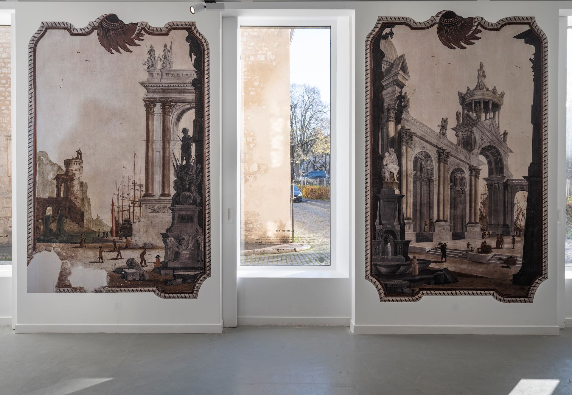 The artistic collective Fokus grupa has been active since 2012. In their work, they aim to establish a critical framework for interpreting the artistic, economic, and political environment. Fokus grupa borrows and learns from design, architecture, curatorial practice, and writing, and often involves collaborators from other fields. Vedutas from the Palace of the Privileged Company of Trieste and Rijeka (2018-2024) is an ongoing artistic research project that explores the historical involvement of the city of Rijeka in the global economy, which was fueled by slave labor. Located in the oldest Austro-Hungarian sugar refinery, established in the mid-18th century in Rijeka, a series of “idealized” landscapes painted by unknown painters feature depictions of slaves.
